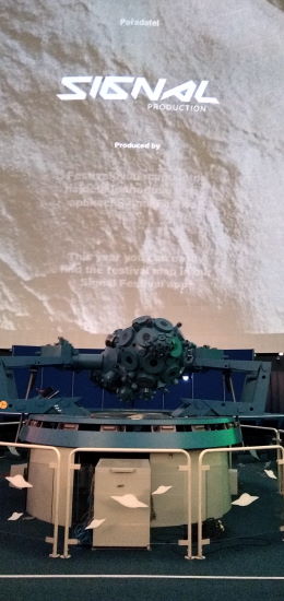 Na další dvě placené instalace se musíme vydat na druhý břeh Vltavy do Holešovic. Letos organizátoři poprvé využili stálé zařízení k projekci jednoho programu. V planetáriu v Královské oboře je k vidění krátký dokument “Radikální kompromis” od tvůrčí skupiny, která vznikla přímo pro tuto příležitost, Planetum x Signal Production tvořené umělci Danielem Červenkou, Markem Šilpochem, Pavlem Karafiátem, Martinem Fuchsem a Trauma & Errol Vitro. Na 23,5 metrů široké kopuli jsme svědky krátkometrážního fulldome show příletu asteroidu s totálně devastovaným povrchem. Vše vypadá, jako katastrofické sci-fi vytvořené v počítači pološíleného umělce až do okamžiku, než si uvědomíme, že se díváme na záběry z dronů létajících vysoko na sokolovskou hnědouhelnou pánví. Film byl natočen bez jediného CGI efektu k dotvoření zobrazovaných krajin. Byla použita pouhá deformace obrazu, kdy se pohledy na totálně zničenou krajinu postupně vynořují z přilétajícího asteroidu.