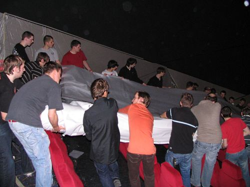 Instalace nového plátna v únoru 2011 v pražském IMAXu. Po jedenácti letech bylo v září 2022 opět vyměněno za nové. Díky statické elektřině, se na pokovený povrch přichytává prach, který bohužel nejde odstranit tak, aby nebyla ostraněna i metalická vrstva pro polarizační 3D projekce. Plátno tak ztrácí postupně svoji odrazivost a po cca 10 letech je nutné jej vždy vyměnit za nové. Foto: autor článku