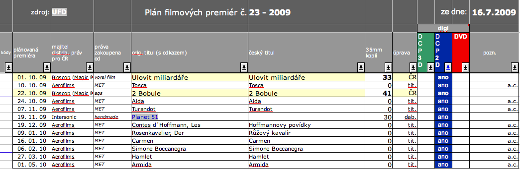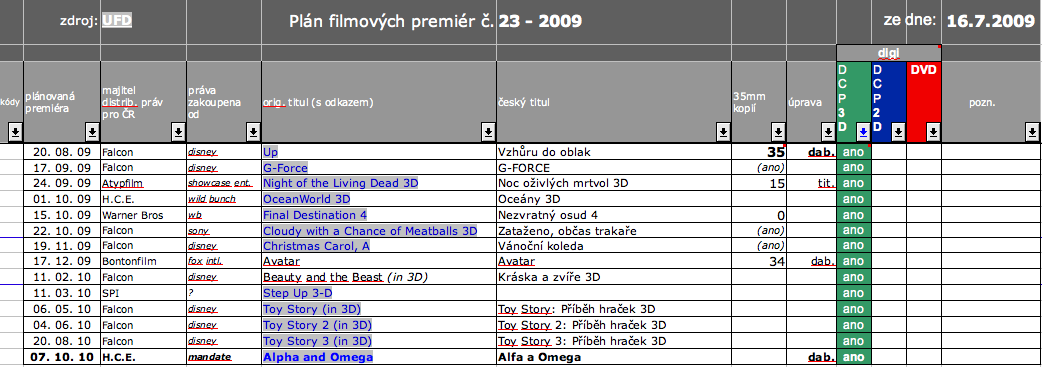 Zde jsem v rychlosti připravil výhled premiér 3D a 2D digitálních filmů. Obzvláště zajímavý je rychlý nástup 3D oproti 2D. Ve 2D zatím jednoznačně vedou záznamy z přenosů z Metropolitní opery. Doufejme že se brzo tento stav vyrovná.
