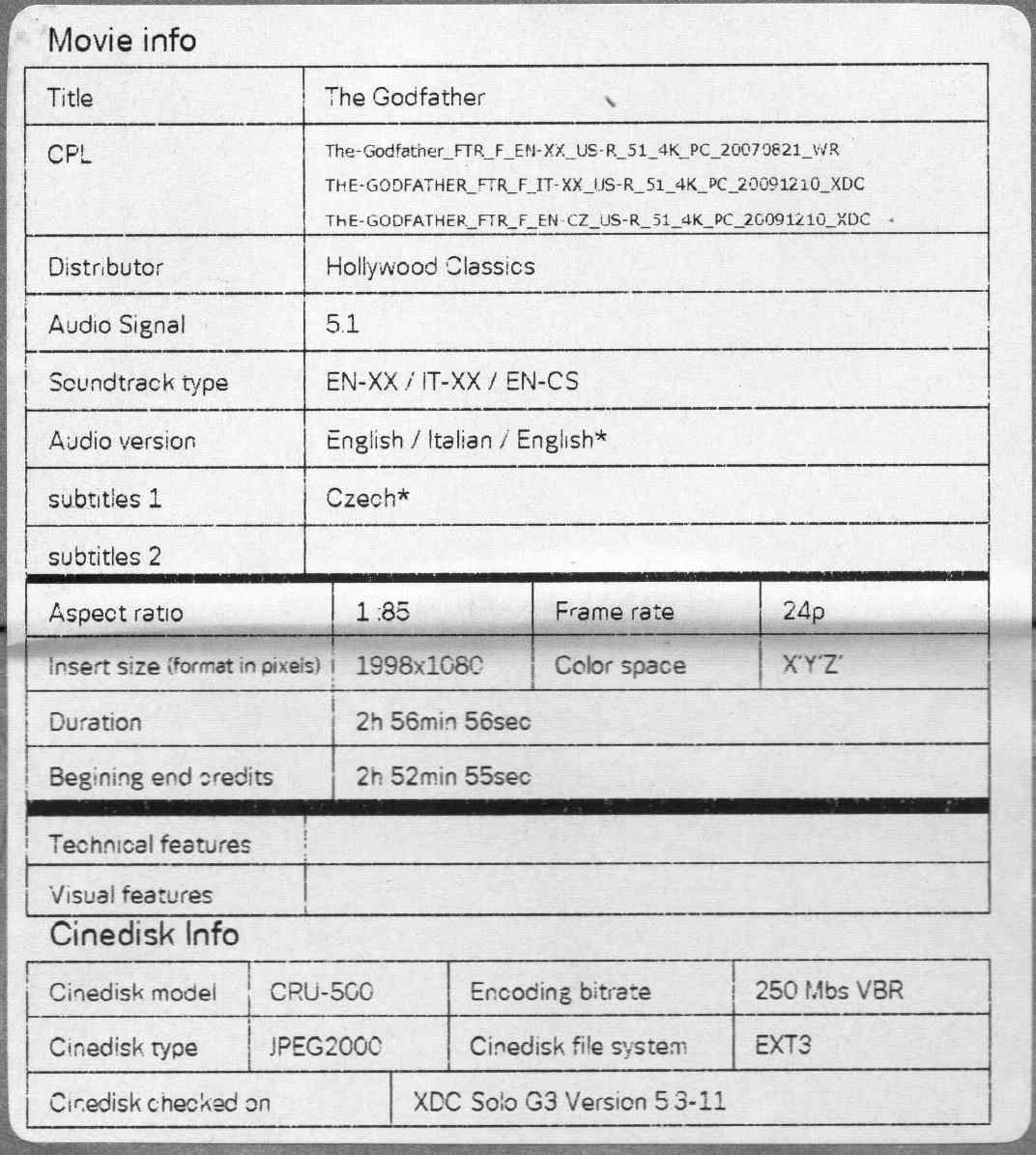 Protože se k nám dostaly v rámci pilotního projektu distribuční společnosti Aerofilms remasterované DCP kopie filmů Kmotr, Někdo to rád horké a Život je krásný, které do Česka dodaly firmy AAM (GB) a XDC (BE), chtěli bychom Vám představit jak taková kopie vlastně vypadá, co obsahuje a jak hraje z digitálního projektoru a serveru.