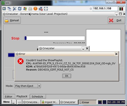 "Doremi udělalo novou verzi SW/FW pro IMB+ShowVault. Bohužel nebyl plně podporován ze strany Christie. Protože jsme měli v některých kinech potíže se synchronizací Dolby 3D, udělali jsme update na poslední verze Doremi IMB/ShowVault a Christie Solaria. Nekompatibilita způsobila přerušení enkrypce. Po konzultaci s tech. support linkami Doremi a Christie se trochu složitějším postupem enkrypce obnovila."