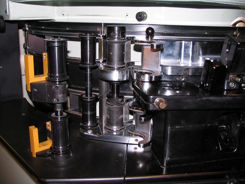 Detailní pohled na dvě filmové dráhy s mechanismem Rolling Loop, který s filmovým pásem zachází podtastně šetrněji, jak klasické strhávací zařízení z maltézským křížem známé z klasických filmových projektorů. Dráhy jsou dvě pro 3-D, každá pro jeden filmový pás pro jedno oko.