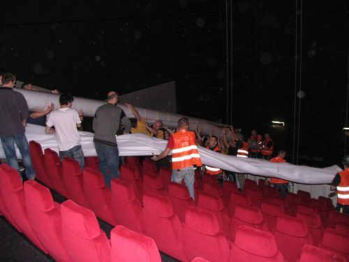 A je to tu! Velká akce začíná. Kromě techniků polské Cinema City, zástupců IMAX Corp. přichází všichni z místního multiplexu, co mají ruce i nohy. Na rozbalení a instalaci téměř tunového plátna je potřeba necelá padesátka lidí.