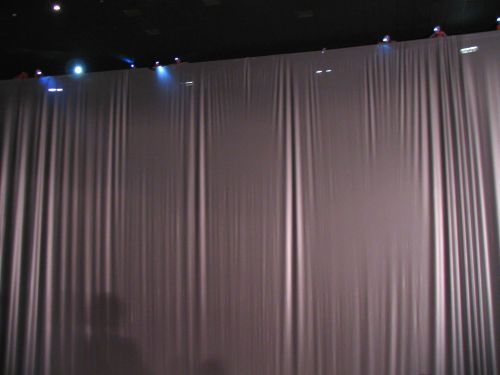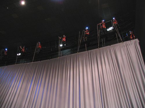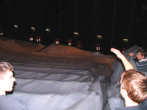 A začíná velmi opatrné vybalování. nejdříve se plátno přes celé hlediště rozbalí.