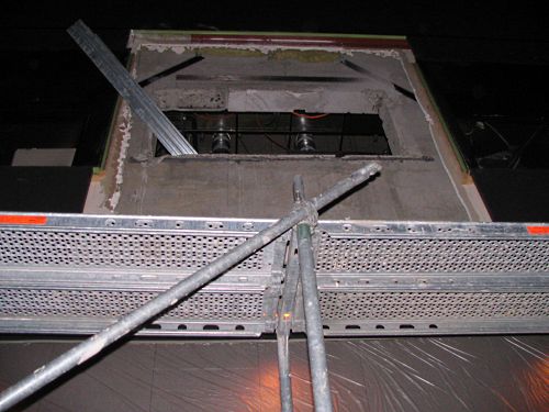 Během pondělka se také musely dokončit všechny práce, jež vytváří prašné prostředí a to včetně rozšíření projekčního okna kabiny, do kterého se vejdou vedle sebe oba nové digitální projektory.
