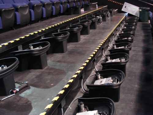 Snímek instalace dvou řad pohyblivých sedadel v sále. Na snímku vidíme spodní části s pohyblivým mechanismem. Zdroj: FTT Cinemedia