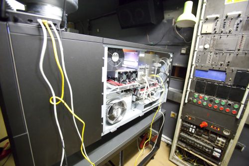 Projektor Sony SRX-R320 mezi dvěma klasickými filmovými projektory MEO 5. 35 mm projekce zůstává v Oku zatím zachována.