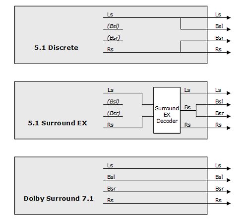 Kanály Bsl a Bsr jsou každý kalibrovány na úroveň 82 dBC SPL, podle stejného standardu jako instalace formátu Dolby Digital Surround EX. Při poslechu v módu Dolby Surround 7.1 se úroveň 82 dB SPL stane referenční úrovní pro každý ze čtyř surroundových kanálu. Níže je uveden přehled mapování surroundových kanálů v každém z již zmíněných formátů ve zvukovém procesoru: