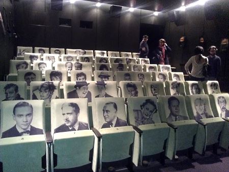 Hlediště malého sálu s kapacitou 51 míst. Každá sedačka je potištěna portrétem jedné slavné filmové osobnosti. Secesní svítidla na boční stěny nestihla dodavatelská firma do zahájení nainstalovat a tak zde alespoň pro představu visely jejich fotografie.