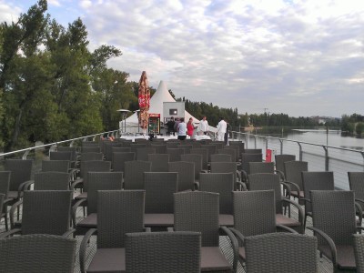 Ale nyní už k samotnému Kinu na lodi. To je vybaveno zapůjčenou technikou standardu DCI od integrátorské společnosti, AV MEDIA, kterou tvoří projektor Christie CP2210 propojený přes Media blok IMB s diskovým polem Doremi Show Vault. Projektor se serverem i zvukovým řetězcem je ukryt ve speciálním hliníkovém boxu s projekčním oknem, který jej chrání před deštěm, větrem, blesky i výpary z palubní myčky nádobí, jež je umístěna přímo pod ním. Na každé lodi byly vždy bojové podmínky. :-)