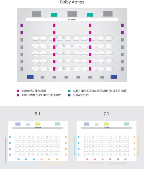 Ilustrační porovnání sálů s rozmístěnými reprosoustavami pro Dolby ATMOS, Dolby Surround 7.1 a klasický 5.1 zvukový systém.