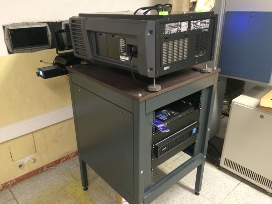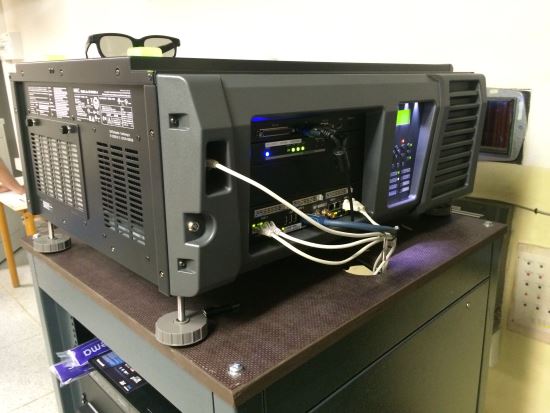 Ten samý projektor zleva. U projekčního okna můžeme na kolejnici vidět pojízdný filtr Depth 3D, který je v poloze mimo objektiv, tedy pro 2D projekci. Autor snímku: Ing. Miloš Tourek, AV MEDIA