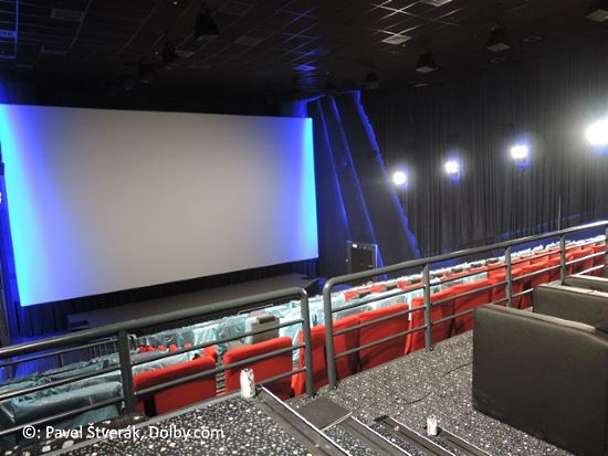 Sál A multiplexu Cinemax v Trnavě. Na protější stěně a na stropě vidíme nainstalované reprosoustavy JBL pro Dolby ATMOS. Autor snímku: Pavel Štverák, Dolby.com
