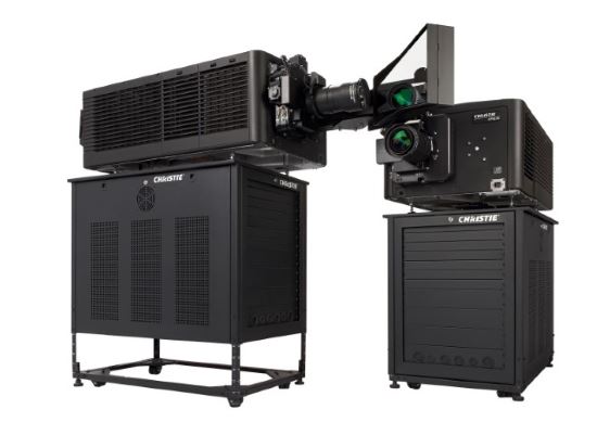 Christie Duo. Zrcadla pomáhají k přiblížení obou projekčních os co nejblíže k sobě pro ce nejmenší zkreslení výsledného obrazu. Tento systém používají ve spojení s laserovými projekory Christie sály Dolby Cinema. Zdroj: christiedigital.com