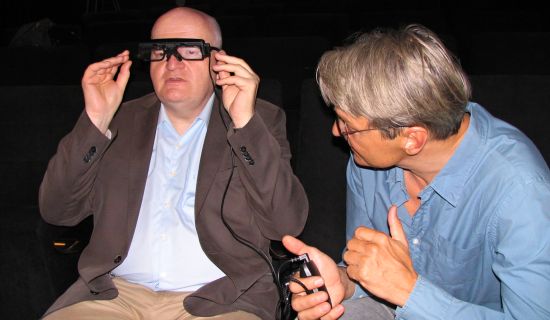 O technologiích pro diváky se zrakovým nebo sluchovým handicapem jsme psali již ve dvou článcích zde a zde. Takže jen stručně připomeňme, že pro titulkovou stopu popisující neslyšícím dialogy slouží buď speciální bezdrátové brýle, ve kterých divák sleduje plátno a zároveň se mu do roviny projekčního plátna promítají přes polopropustné sklo titulky do jednoho oka. Druhým řešením je přenosný bezdrátový displej na ohebném držáku, který si divák v kině většinou umístí do prostoru na kelímek pro pití a displej nastaví tak, aby jej měl v blízkosti pohledu na plátno. Nevýhodou je přeostřování zraku mezi plátnem a displejem. Pro nevidomé pak slouží bezdrátová sluchátka, do kterých se se zvukem filmu zároveň pouští i komentářová stopa.