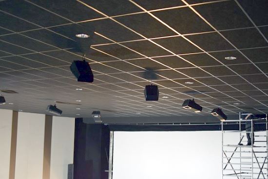 Instalace stropních reprosoustav pro Dolby ATMOS v kině Oko Šumperk. Foto: kinosumperk.cz