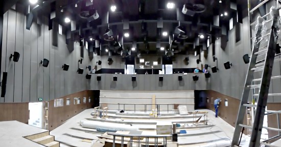 Snímek sálu Biografu Český Ráj v Jičíně při pohledu z jeviště. Stav k 26. dubnu 2018, kdy již byly nainstalovány akustické prvky a satelitní reprosoustavy zn. Mag. A ještě nebyly namontovány sedačky. Foto: autor článku