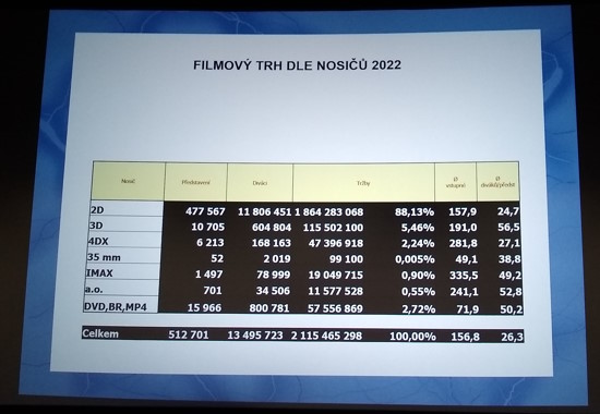 Celý seminář byl zahájen rekapitulací loňského roku Jaroslavem Peckou z Unie filmových distributorů. Loňský rok byl první po dvou předchozích, který nebyl zasažen žádným přímým lockdownem pandemie Covid-19. A zákaz vstupu na kulturní akce bez potvrzení o očkování nebo prodělané nemoci Covid-19 skončil 9. února 2022. Díky tomu přišlo do kin 13 495 723 diváků, kteří na pokladnách zanechali přes dvě miliardy korun na vstupném. Je to o 21 tisíc diváků méně, jak v posledním roce před pandemií, 2019, ale více, jak v letech 2011 až 2015, kdy byly slabší tituly.