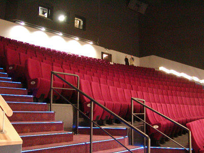 První řada a začátek plátna v IMAX Praha. Jasně je zřetelné, že spodní hrana plátna se nalézá několik metrů pod úrovní první řady. Foto: autor článku