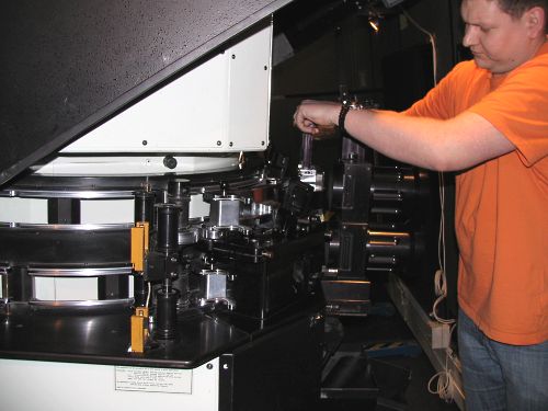 Projektor IMAX GT na 70 mm filmový pás v projekční kabině IMAX Praha v předvečer posledního dne jeho provozu...