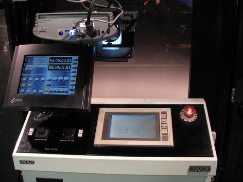 Řídící pult starého IMAXu, od kterého se spouští i zastavuje celé představení. Malý dataprojektor nahoře je titulkovací zařízení systému DTS.