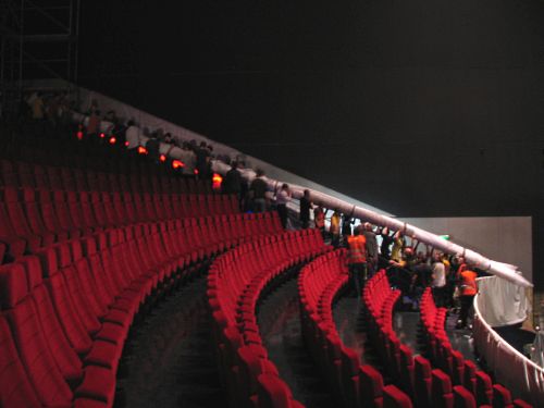 Po demontáži starého plátna byly do prostoru za rámem nainstalovány nové reprosoustavy. Vidíme nový levý, středový a pravý, pod nimi nový subwoofer. Reprosoustava v horní části zůstává původní a patřila dříve takzvanému hornímu efektovému kanálu, který zřejmě nebude u IMAX DIGITAL vůbec používán.
