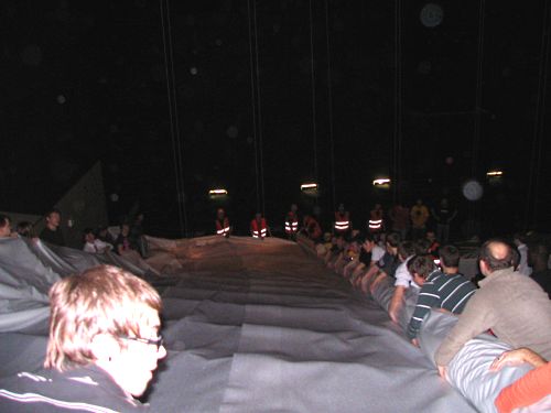 A plátno je definitivně na vrcholu rámu. Nyní jej čeká další složitá operace, kdy se sál vytopí na teplotu vysoko nad 30°C. Vyhřáté plátno se pak natáhne na samotný rám a postupným ochlazováním na běžnou teplotu se smršťováním vyrovnají všechny vzniklé faldy a dojde k jeho dokonalému vypnutí.