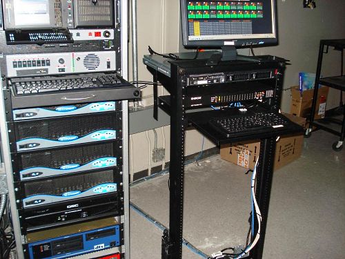 Pohled do projekční kabiny, kde k racku vlevo s kinoserverem, zvukovým procesorem a koncovými zesilovači přibyl vpravo systém pro pohyb D-Box sedaček. Zdroj: FTT Cinemedia.