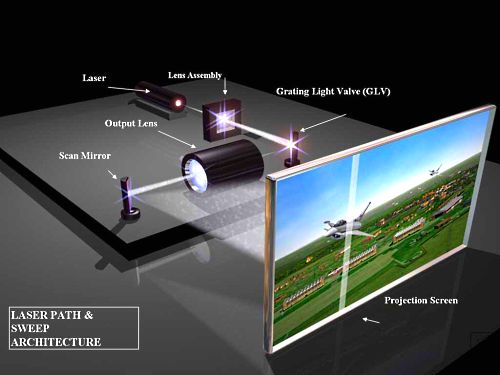I přes tento nedostatek se ale laser nevzdává. Základem laserových projektorů je takzvaný GLV čip fungující na vzdáleně podobném principu jako čip DMD u technologie DLP. S tím rozdílem, že v GLV nejsou vychylující se zrcátka, ale podélné odrazné pásky, které se elektrickým napětím řízeně prohýbají do různých oblouků a vychylují laserový paprsek na principu difrakce. Tím se vytváří obraz ve sloupcích, do řádků se dostává pomocí rotujícího skenujícího zrcadla.