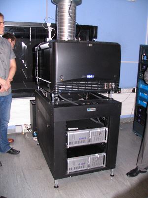 Vlastní projekce obrazu je realizována ve 2K rozlišení z klasického projektoru Barco DP2K-32B. V piedestalu jsou vidět dva kinoservery Doremi ShowVault s identickým obsahem na diskovém poli. V případě problémů může operativně zastoupit záložní. Pro 3-D se používá standardní systém MasterImage. Foto autor článku.