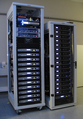 Rackové skříně s kinoserverem, zvukovými procesory a koncovými zesilovači zatím jediné české instalace v Premiere Cinemas Park Hostivař. Na snímku nevidíme všechny koncové zesilovače. Třetí řada se nalézá vpravém menším racku i z druhé strany. Zdroj: autor článku
