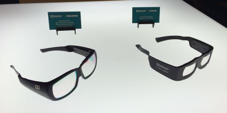 Porovnání brýlí pro 3-D Dolby systém laserových projektorů Christie (vlevo) a Barco (vpravo). Autor snímku: Miloš Tourek