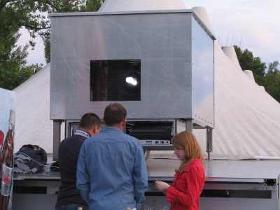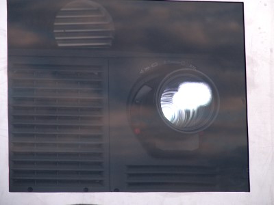Projektor ukrytý v ochranném hliníkovém boxu s kinoserverem a zvukovými zesilovači. Myčka nádobí se nalézá v objektu pod projektorem a oblaka páry jsou v nepravidelných intervalech vypouštěna škvírou na úrovni ruky slečny v červeném kostýmku. Uklidnění pro diváky. Během představení se nádobí již nemyje. :-)