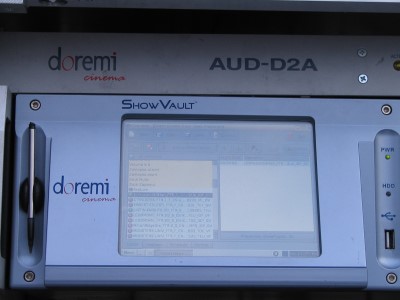 Detail displeje kinoserveru Doremi Show Vault s připravenými tituly pro první týden. Kino na lodi bude promítat prakticky denně každý večer po setmění.