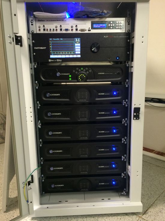 Zvukový rack kina v Boru u Tachova. Od zhora vydíme multimediální převodník Gefen, pod ním zvukový procesor DataSat AP-20 a sedm koncových zesilovačů Crovn. Autor snímku: Ing. Miloš Tourek, AV MEDIA