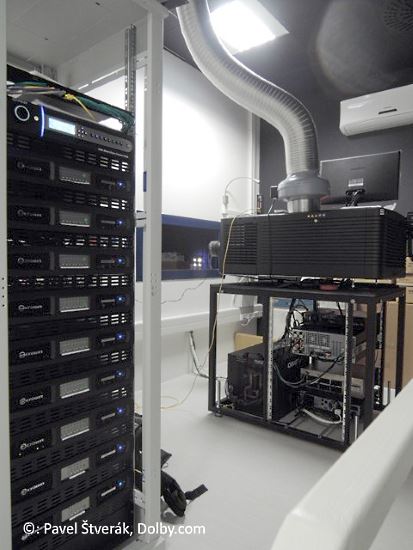Pohled do projekční kabiny sálu A Cinemaxu v Trnavě. Vlevo vidíme část rackové skříně určené pro zvukový řetězec s audioprocesorem Dolby CP850 a koncovými zesilovači Crown. Na piedestalu pak poznáme projektor Christie. Autor snímku: Pavel Štverák, Dolby.com.