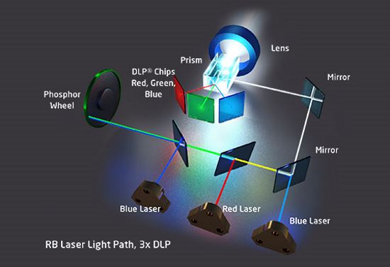Jak jsem psal již minule, při vývoji laserových projektorů ve společnosti NEC se pokusili vyvinout levnou alternativu k dosti nákladné technologii RGB laserového projektoru. Pracovali s laserem za nejnižší pořizovací náklady, modrým, vyráběným i pro Blu-ray mechaniky. Modré laserové světlo přeměnili pomocí fosforového filtru na bílé a to použili jako zdroj koherentního světla, který je posléze směřován na klasický Light Engine.