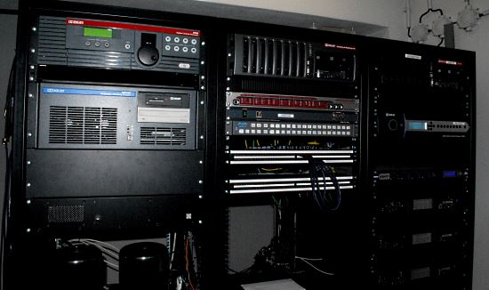 “Srdce” Black Studia, racková skříň s řídícími procesory. Levá část je určená ještě pro míchání zvuku pro 35 mm filmový pás. Není to zbytečnost, studio ještě mívá zakázky pro tento mix. Uprostřed vidíme část pro vytváření a renderování zvukového formátu Dolby ATMOS. V horní části je samotný Dolby Rendering & Mastering Unit, kde výsledná nahrávka vzniká. V pravé části vidíme úplně nahoře kinoserver Dolby DSS-200 pro QC = kontrolu DCP před duplikací a distribucí. Pod ním už znalý čtenář pozná procesor Dolby CP850 pro dekódování formátu Dolby ATMOS a jiných. S modrým displejem po pravé straně je BSS Blu - Soundweb, což je v principu elektronická výhybka, která umožňuje operativní rychlé přepojování zapojení reprosoustav v míchací hale podle momentální funkce haly (35mm, mix , DCP playback). A pod ním vidíme už jednotlivé koncové zesilovače. Zdroj obrázku: autor článku